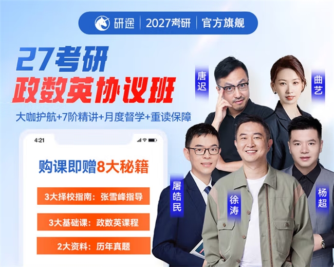 随着就业压力增大和对高学历人才需求的增加,考研成为不少应届毕业生的热门选择。研途2027考研政英数协议班,师资团队由徐涛等教育领域大咖领衔,并配套智能化学习工具,课程采用多阶精学体系,通过月度督学机制确保学习进度。现在购课即赠包含张雪峰指导的择校指南、政数英三大基础课程及历年真题资料包在内的“八大秘籍”,为考生提供从学习、备考到择校的全面支持。